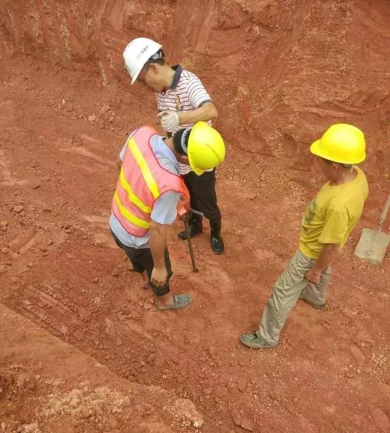 四、动力触探、验槽土方检底后,立即组织第三方检测单位人员按设计及规范要求进行动力触探,动力触探按20m间距/每点,如实记录锤击数,作为地基承载力、设计等多方人员验槽的依据,及时会同监理单位等有关部门,进行基槽核验,对存在问题妥善处理后,立即组织下道工序施工,防止长时间晾槽。
